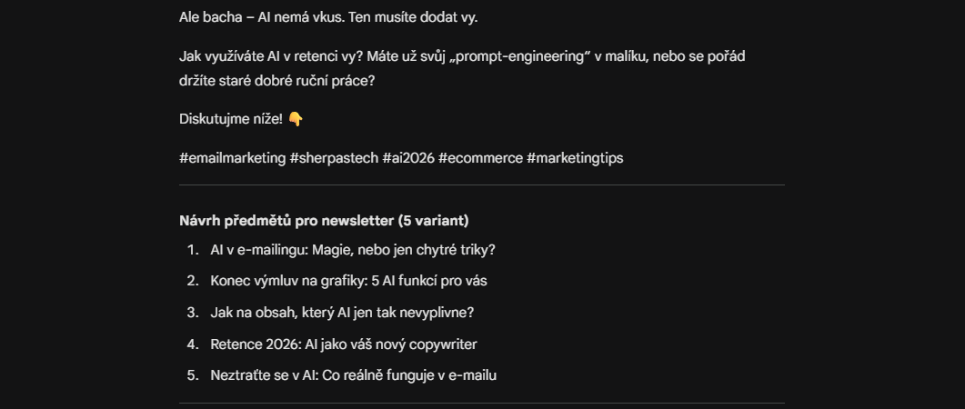 Ukázka z Gemini - návrhy předmětů pro newsletter na téma tohoto článku