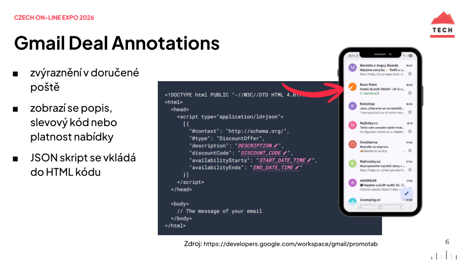 Předmět je první (a často poslední) šance, jak zaujmout příjemce, algoritmus i AI asistenta. Podle naší studie e-mail marketingu v ČR 2025 je nejpoužívanější slovo v předmětech newsletterů e-shopů sleva a její různé tvary, a v každém druhém předmětu se objevuje emoji. A zatímco se všichni perou o pár znaků v předmětu, naprosté minimum e-shopů využívá strukturovaná data - Gmail Annotations Tab. Tato funkce vám dovoluje zobrazit v inboxu kód na slevu nebo termín expirace nabídky, aniž by uživatel musel e-mail vůbec otevřít.