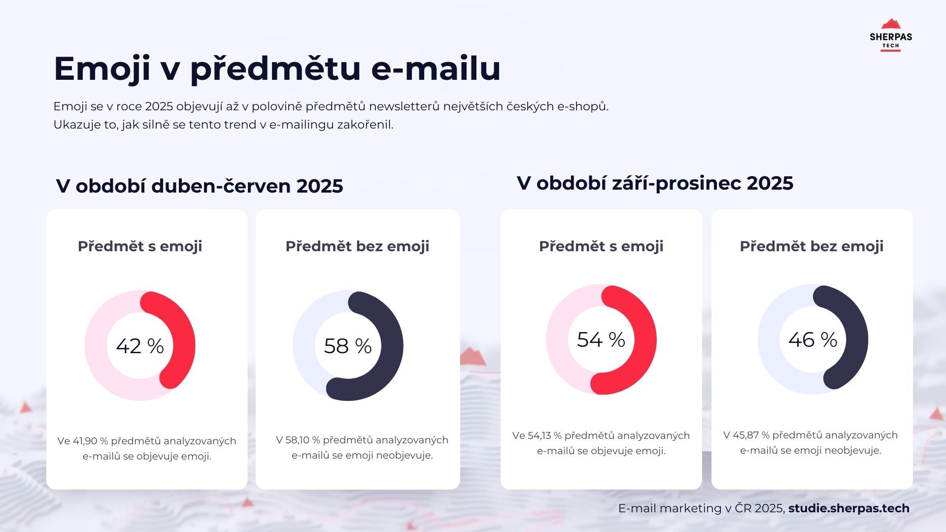 Listopadové newslettery měly jedno společné: téměř polovina všech e-mailů obsahovala v předmětu některou z variací na Black Friday – od Black Week a Black Days až po Black November nebo černý pátek. Silně rostla i práce s emoji. Během roku se vyskytují zhruba ve 40 % předmětů, ale v listopadu vystřelily na 64 %.