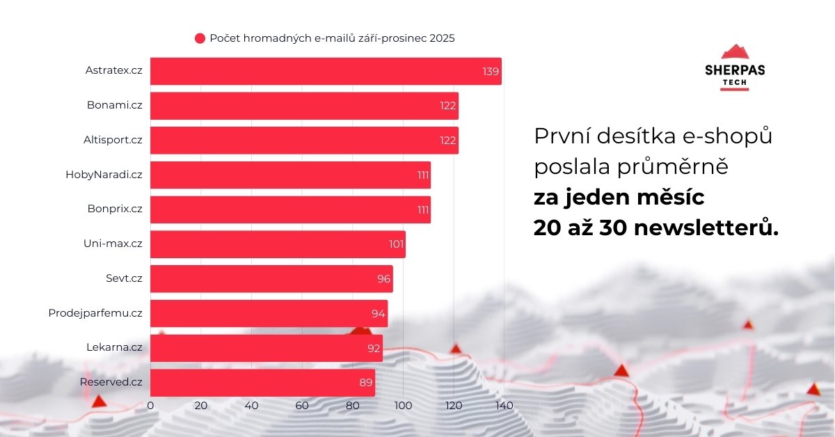 Celkový počet newsletterů na jednoho odesílatele za měsíc se v období od září do prosince 2025 oproti jarnímu období v zásadě nezměnil. Na jaře 80 % e-shopů neposílalo více než 10 rozesílek měsíčně, na podzim je to 75, 8%. Nicméně některé e-shopy frekvenci rozesílek zejména v listopadu v souvislosti s Black Friday zvýšily. V listopadu tak došlo k nárůstu o 10 % v celkovém počtu doručených e-mailů a v prosinci o cca 9 %.