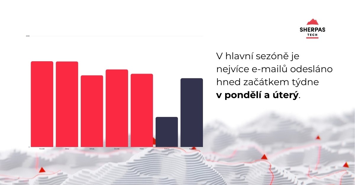Téměř 80 % všech e-mailů je odesláno během pracovních dnů od pondělí do pátku. Zatímco na jaře bylo nejvíce e-mailů posláno v úterý a ve středu, v hlavní sezóně je nejvíce e-mailů odesláno hned začátkem týdne v pondělí a úterý. K největšímu poklesu po obě období dochází v sobotu. Je zajímavé, že na podzim je objem e-mailů poměrně vysoký v neděli, která dosahuje hodnot středy a pátku.