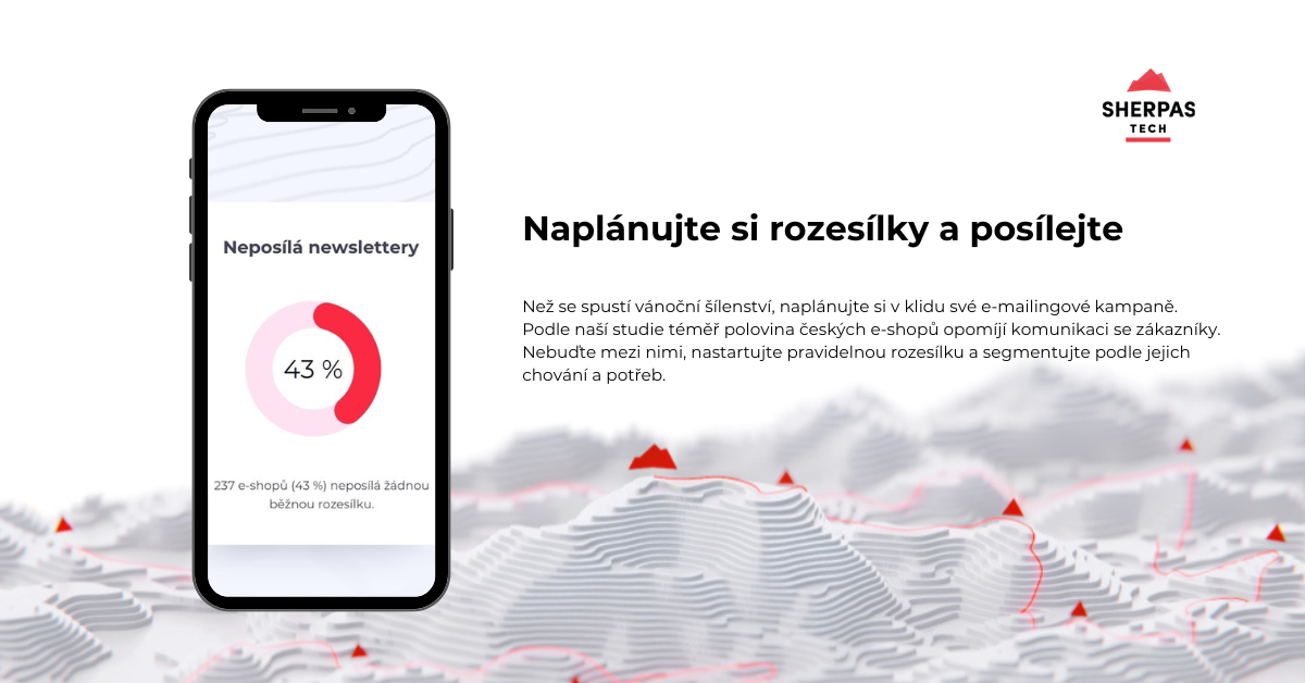 Podle naší studie téměř polovina českých e-shopů opomíjí komunikaci se zákazníky. Nebuďte mezi nimi, nastartujte pravidelnou rozesílku a segmentujte podle jejich chování a potřeb. Pokud někdo provedl nákup už loni, pošlete mu jinou nabídku než někomu, kdo se ještě nerozhodl. Tím docílíte toho, že vaše e-maily budou relevantní a nebudou působit jako spam.