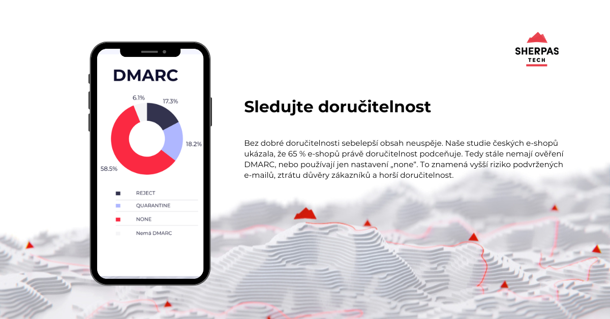 Naše studie českých e-shopů ukázala, že 65 % e-shopů právě doručitelnost podceňuje. Tedy stále nemají ověření DMARC, nebo používají jen nastavení „none“. To znamená vyšší riziko podvržených e-mailů, ztrátu důvěry zákazníků a horší doručitelnost. Správné technické nastavení je pro doručitelnost zásadní. Jinak nemáte jistotu, že vaše zprávy dorazí tam, kam mají – do schránky zákazníka.