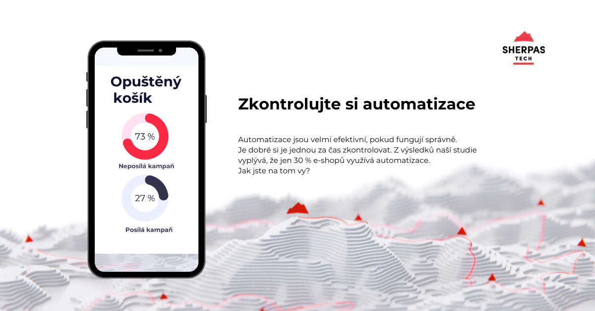 Z výsledků naší studie vyplývá, že jen 30 % e-shopů využívá automatizace. Jak jste na tom vy? Welcome kampaně nebo opuštěný košík dokáží oslovit zákazníka ve správný čas, zvýšit konverze a vrátit investice do akvizice. Přesto je většina e-shopů nechává ležet ladem. Pokud je ještě nepoužíváte, získejte náskok před konkurencí a nastavte si je.